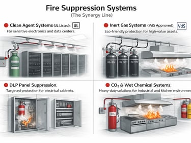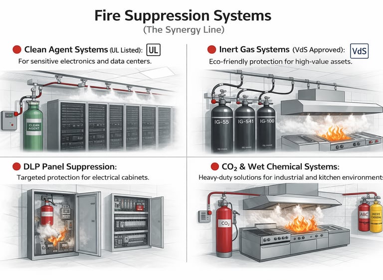 Clean Agent Systems (UL Listed): For sensitive electronics and data centers.